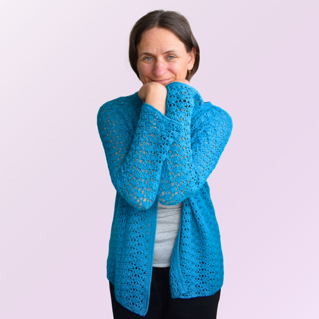 Danach durfte meine Community mitentscheiden, welches Muster als Nächstes in einen Cardigan verwandelt wird – gewonnen hat das Lace-Muschel-Muster. Ich habe mich bewusst für eine dünnere Wolle entschieden, und so ist ein leichter, luftiger Sommer-Cardigan entstanden: Der Lace Muschel Cardigan ist perfekt zum schnellen Überwerfen, elegant und angenehm zu tragen. Natürlich wieder flexibel anpassbar – sogar bei den Ärmeln kannst du entscheiden, ob du sie weiter oder körpernah arbeiten möchtest.