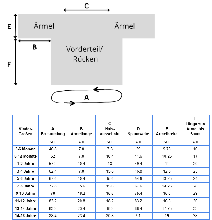 Bei Pullovern empfehle ich ehrlich gesagt etwas anderes: Schnapp dir einfach einen gut passenden Pullover aus dem Kleiderschrank deines Kindes und miss den aus: am besten die Brustweite, die Gesamtlänge und die Ärmellänge.
